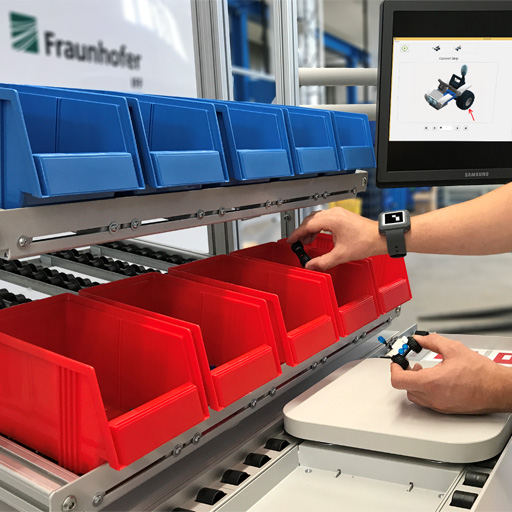 Eine Lösungsmöglichkeit liegt in der intelligenten Verknüpfung bildbasierter Analysemethoden mit der Funktionalität von Smart Devices, um Greifoperationen des Mitarbeiters am Montagearbeitsplatz zu unterstützen. Sensoren erfassen echtzeitnah in einer Kombination von Tiefenbild- und Bildanalyse die Greifbewegung des Arbeiters, in dem sie 2D-Marker an den Händen fortlaufend analysieren. Fehler in der Greifhandlung werden unmittelbar beim Auftreten erkannt und dem Mitarbeiter mitgeteilt. Auf dieser Grundlage können Pick- und Montagetätigkeiten produktiver gestaltet sowie optimal überwacht werden, ohne die Persönlichkeitsrechte zu beeinträchtigen.